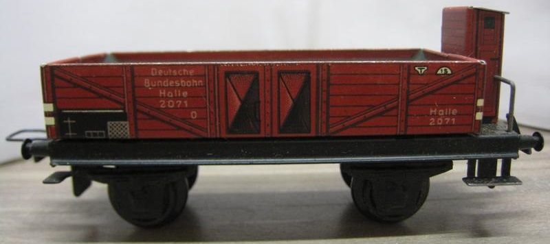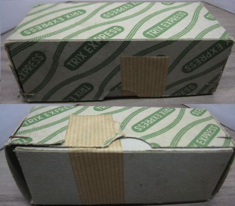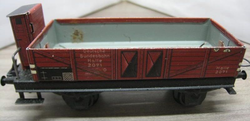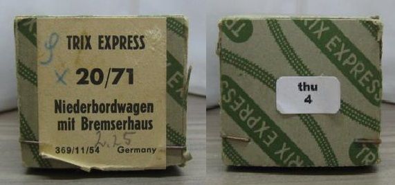 Trix Express 20/71 Niederbordwagen mit Bremserhaus (thu4) rundum sehr schön Erhalten, im grün/grauen Original Karton.
