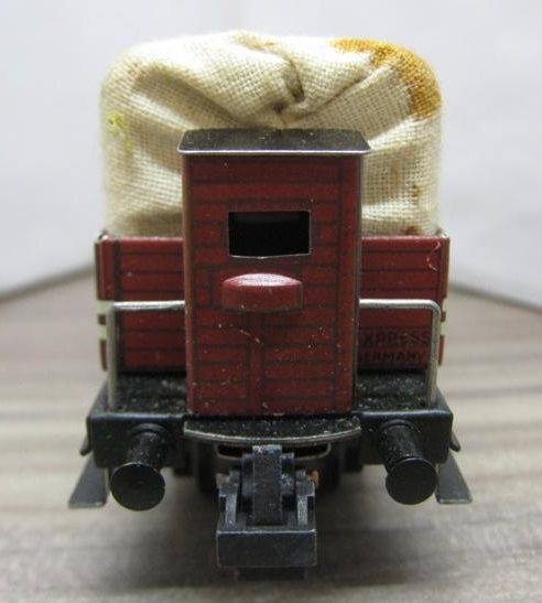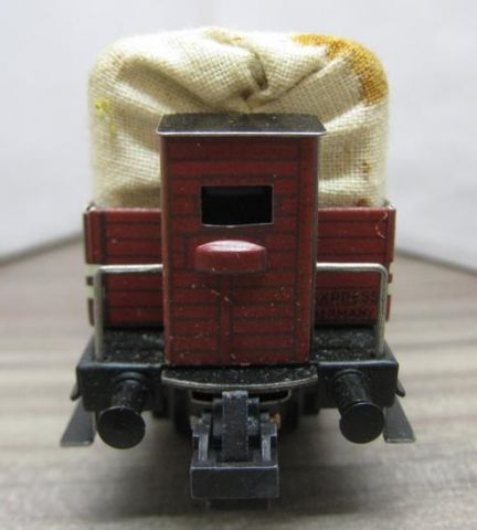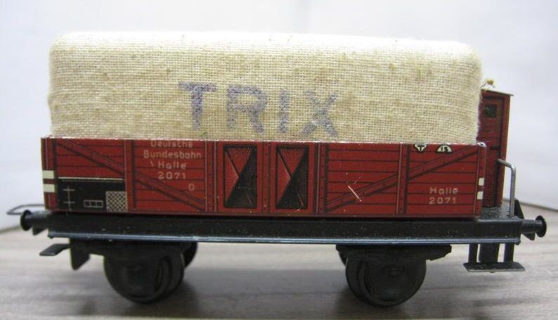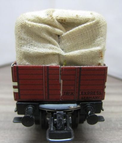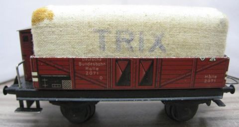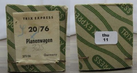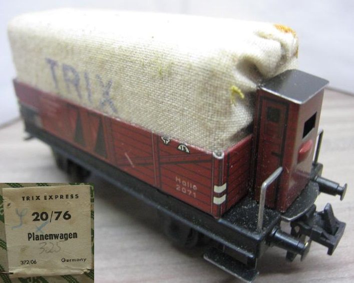 Trix Express 20/76 Planewagen in OV (thu11) rundum sehr schön Erhalten, Plane etwas verstaubt mit einem der üblichen Rostflecken des Spanbleches, im grün/grauen Original Karton.