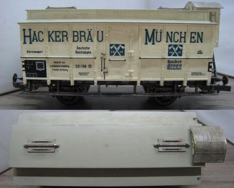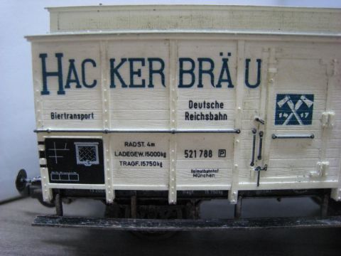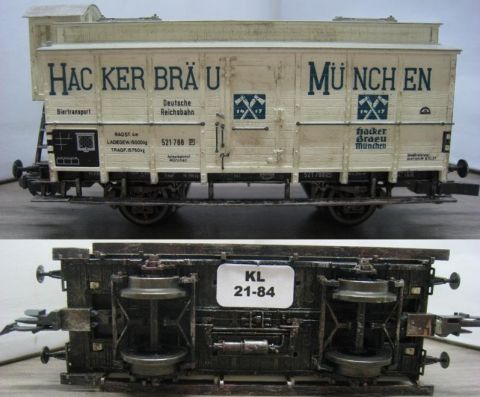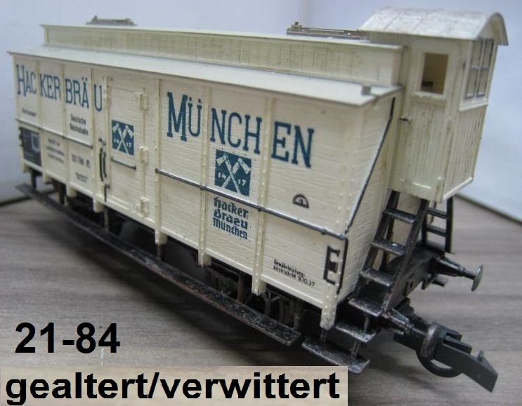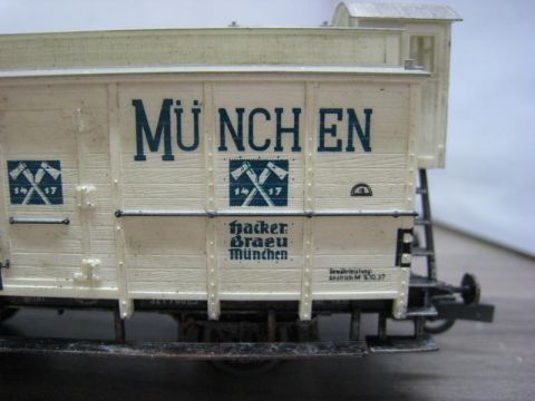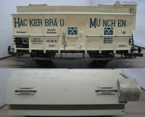 Trix Express 33592 Bierwagen "Hackerbräu" München der DR (21-84) der Wagen wurde meisterlich farblich behandelt (gealtert/verwittert) sehr realistisch, kommt mit den Abgebildeten Roco Kurzkupplungen im NEM Schacht, also problemlos gegen andere Kupplungstypen austauschbar, sehr schön Erhalten ohne OV.