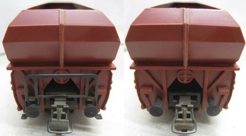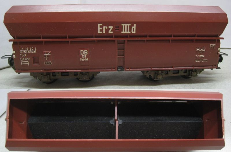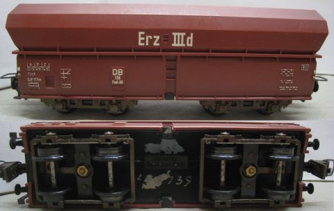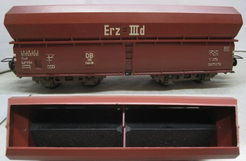 Trix Express 3487 Schüttgutwagen Erz IIId (rrc22) "Erz IIId" weiß aufgedruckt, brünierte Drehgestelle, am Fahrgestell unten blättert (im Betrieb oder in der Vitrine, nicht sichtbar) der schwarze Lack, sonst sehr schön Erhalten im Original Karton.