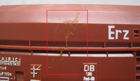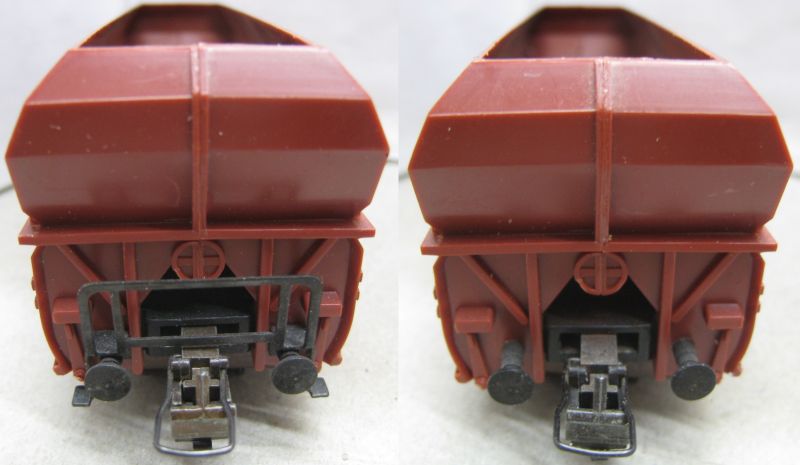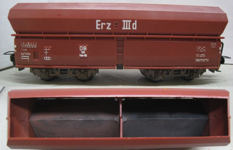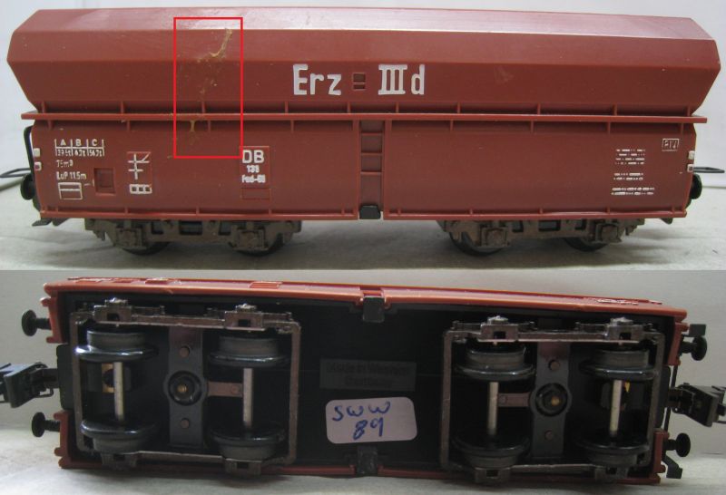 Trix Express 3487 Schüttgutwagen "Erz IIId" weiß aufgedruckt (sww89), Gattungszeichen aufgedruckt, brünierte Fahrgestelle, Anhaftung an der Seite, sonst sehr schön Erhalten o. OV