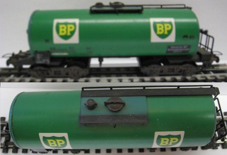 Trix Express 491 3491 4A Tankwagen BP 3. Bauserie (rwg149) jetzt mit geänderter Wagennummer 21 80 005 1290-1, beide Laternenhalter vorhanden, das Kesselblech wurde nach dem erstellen der Bilder eingepasst, beide Laternenhalter vorhanden, sehr schön Erhalten, siehe Bilder.