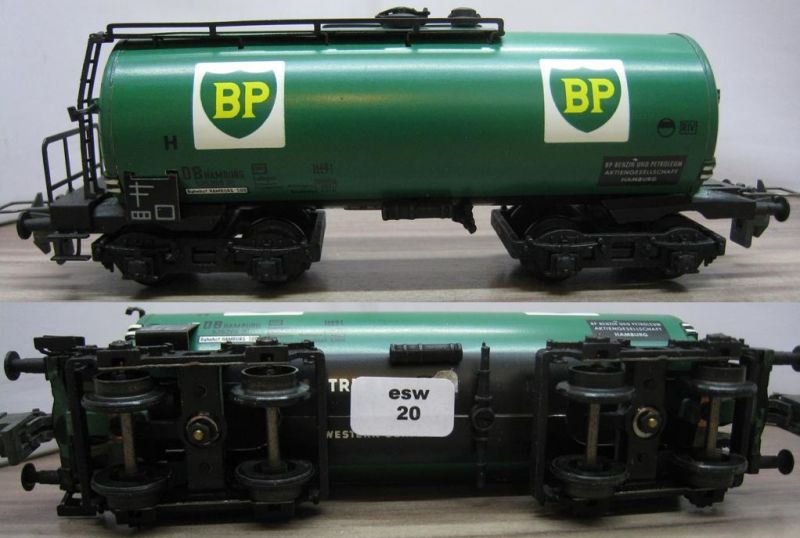 Trix Express 491, 3491 Kesselwagen 4A "BP (esw20), 1962-69 Besitzer Kennung "Benzin und Petroleum Aktiengesellschaft Hamburg", mit schwarz/weißen Begrenzungsecken, Laternenhalter Original, sehr schön Erhalten.