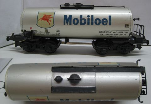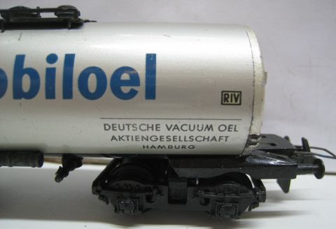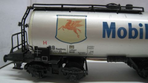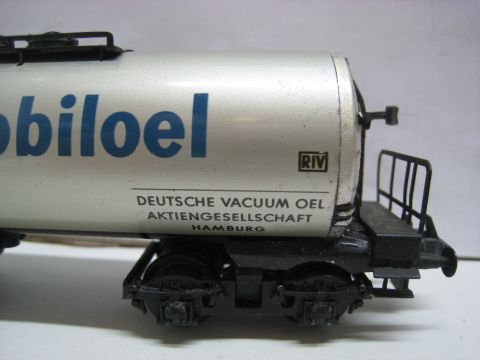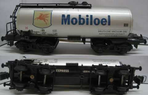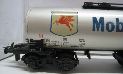 Trix Express 20/92M 493 3493 Mobiloil großer Pegasus (us3142) 1954-56, die roten Pegasus ist einseitig etwas verblichen, der Klarlack an den Stirndeckeln mit leichtem Gelbschimmer, minimale Krakele, noch schön Erhalten im Original Laschen Karton.