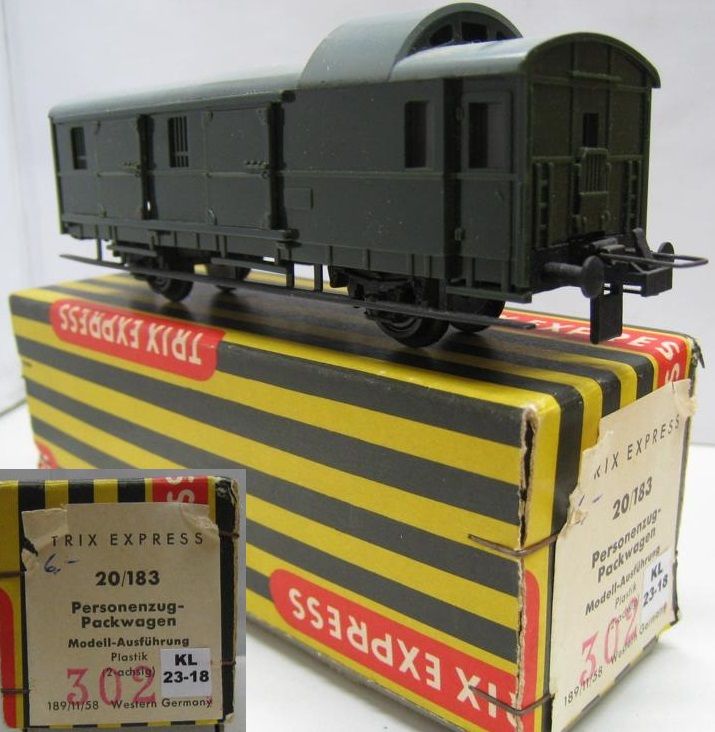 Trix Express 20/183 302 Personenzug Packwagen (23-18) sehr gut im alten 20/183 Karton welcher zur Auslieferung mit der neuen Katalog Nr "302" gestempelt wurde. Wagen und Original Karton sehr gut Erhalten.