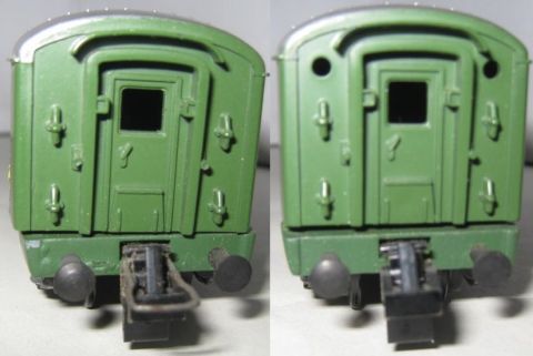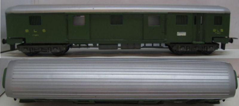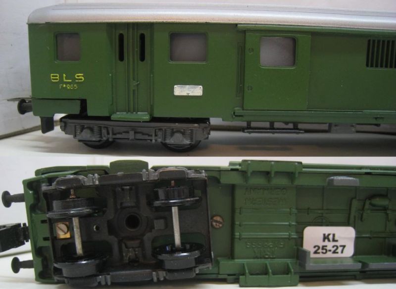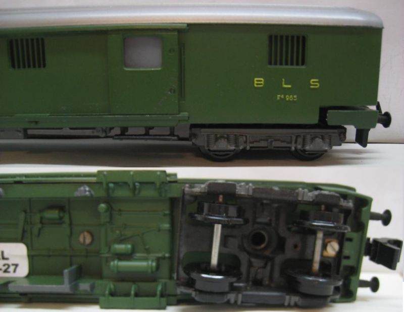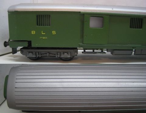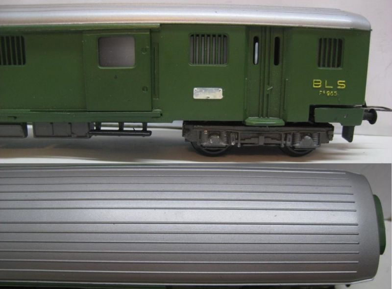 Die BLS Wagen in hellem resedagrün in dieser Erhaltung sind extrem selten, da Trix seinerzeit einfach die grünen Gehäuse reseda überspritzt hatte, ohne den Untergrund vorzubereiten. Was dazu führt das die Farbe nur sehr wenig Haftung hat und bei der geringsten mechanischen Belastung abplatzt.