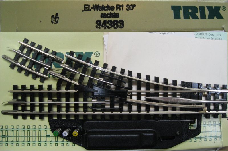 Trix Express 34363 elektrische Weiche R1 30° rechts mit Ausgleichs Stück, letzte Serie, gelblicher Schienenstrang, blanker Mittelleiter TOP/OV aus Laden Fund.