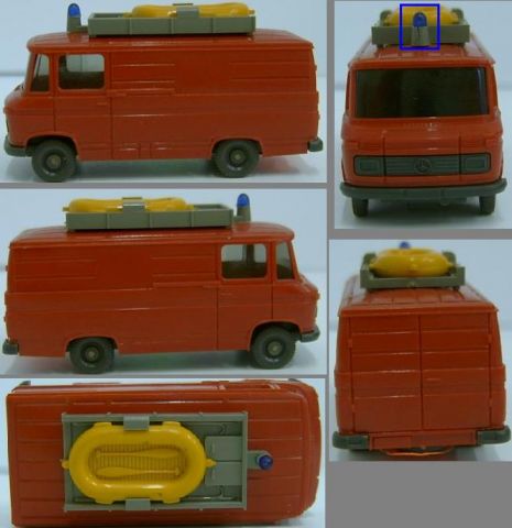 Wiking 605/3, Wasserrettung MB L 406 der Feuerwehr, w 49 / Chassis vermutlich bassaltgrau, Dachaufbau Betongrau, Schlauchboot orangegelb, bis auf einen winzigen Spannungsriß in der Blaulichteinfassung (siehe blaue Makierung auf Bild 2), keinerlei Abbrüche oder Fehlteile erkennbar, vom stehen auf der Modellbahn etwas eingestaubt, sonst sehr schön Erhalten, siehe Bilder.