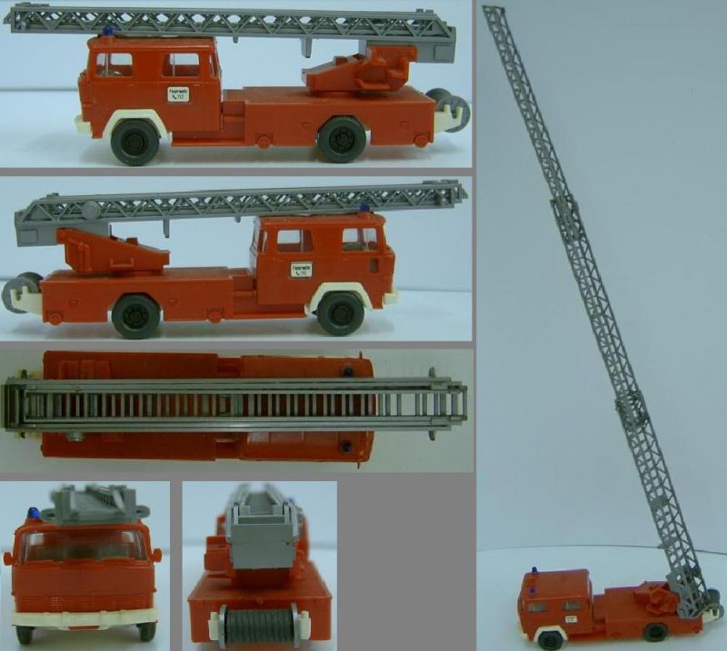Wiking 620/40, Leiterwagen DLK 23-12 der Feuerwehr, w 59 / Fensterverglasung klar, neuses Gehäuse freistehende Blinker, leider fehlt der Korb, sonst keinerlei Abbrüche oder Fehlteile erkennbar, vom stehen auf der Modellbahn etwas eingestaubt, sonst sehr schön Erhalten, siehe Bilder.