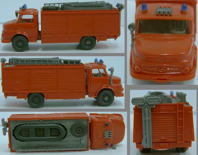 Wiking 623/?, Rüstwagen mit Boot, MB L 1413, w 54 / der Feuerwehr, tiefe Aussparung zwischen Tank und Druckluftbehälter, ohne Blinker neben den nicht bemalten Scheinwerfern, keinerlei Abbrüche oder Fehlteile erkennbar, vom stehen auf der Modellbahn etwas eingestaubt, sonst sehr schön Erhalten, siehe Bilder.